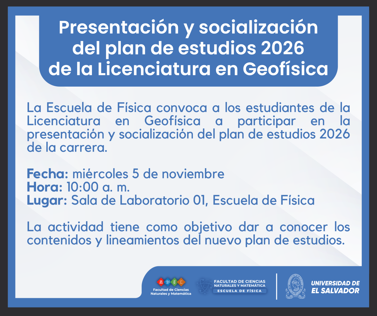 La Escuela de Física invita a los estudiantes de Geofísica a participar en la jornada de presentación y socialización del plan de estudios 2026, que se desarrollará el miércoles 5 de noviembre en la Sala de Laboratorio 01.